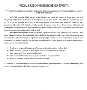Vydajte sa na cestu bezpodmienečného života a vytvorte si životné podmienky, ktoré budú podporovať vaše sny, ciele a bezpodmienečnú víziu. Vízia bezpodmienečného života vás postaví na štartovaciu čiaru k bezpodmienenčnému životu a určí smer, ktorým by ste sa mali odteraz uberať. Ak chcete niečo vo svojom živote zmeniť, určitá časová, ale aj emočná obeta je nevyhnutá. Písanie bezpodmienečnej vízie si vyžaduje trpezlivosť a precvičovanie.